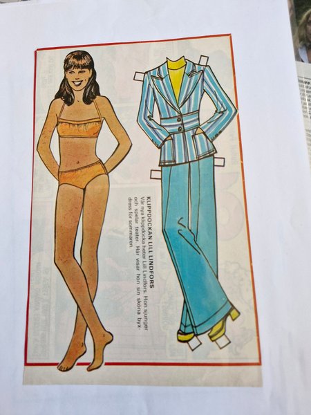Klippdocka föreställande Lill Lindfors. Hon är avbildad i baddräkt och med en byxdress.