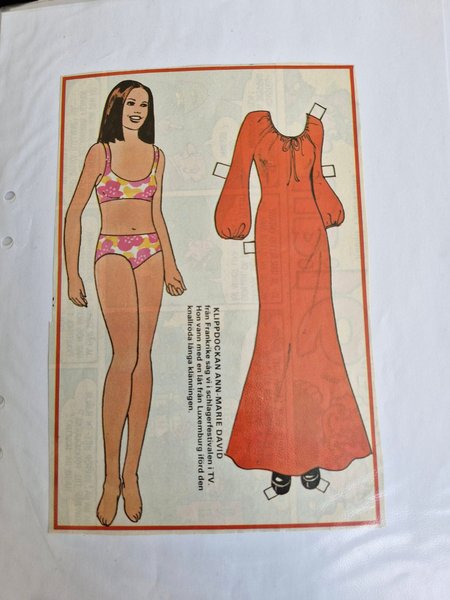 Klippdocka föreställande Ann-Marie David från Frankrike. Hon sågs i schlagerfestivalen i TV och vann med en låt från Luxemburg. Klippdockan har en knallröd lång klänning.