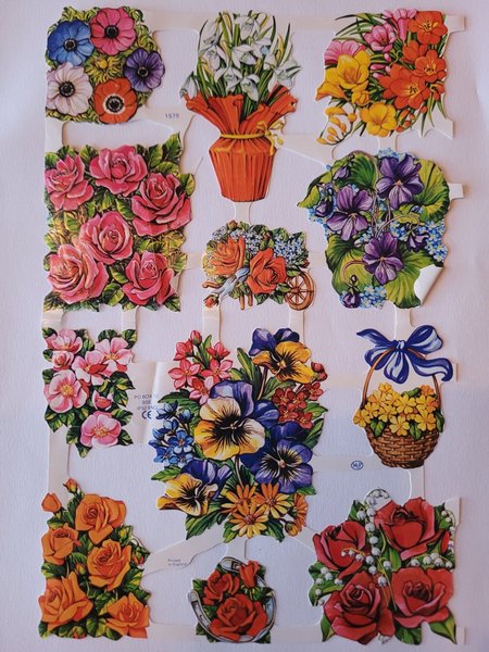 Dessa bokmärken är i form av olika blombuketter och arrangemang. De har en detaljerad design med livfulla färger. Motiven inkluderar rosor, penséer, anemoner, snödroppar och andra blommor, arrangerade i vaser, korgar och som fristående buketter. Vissa motiv har även små detaljer som band och hjul.