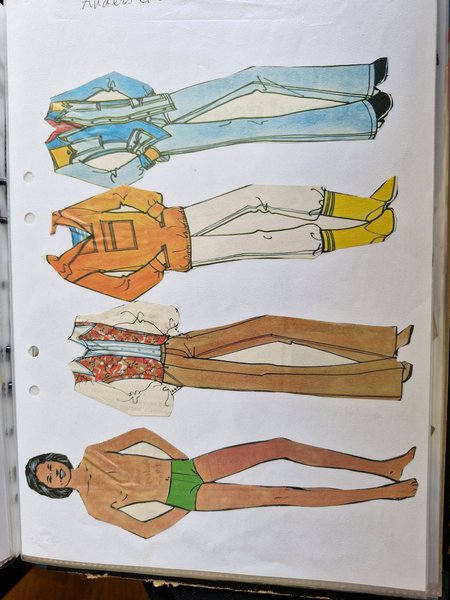Pappersdocka med tre olika kläduppsättningar. Dockan har mörkt hår och bär gröna underbyxor. Kläderna inkluderar ett par blå jeans med matchande jacka, en orange jacka med vita byxor och gula stövlar, samt en mönstrad väst med bruna byxor.