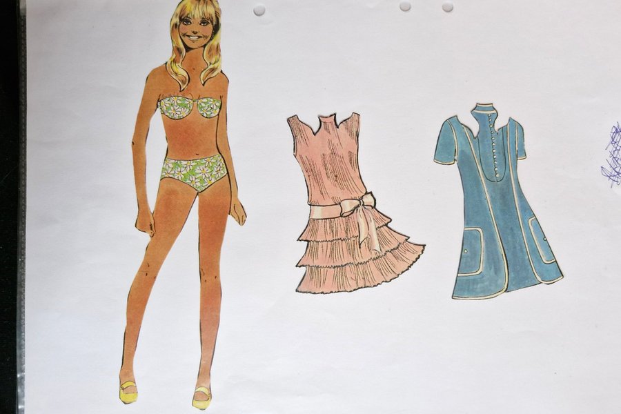 Detta är en pappersdocka med två tillhörande klädesplagg. Dockan är avbildad i en grönvit blommig bikini. De två klädesplaggen är en rosa klänning med volanger och en blå klänning med knappar och fickor.