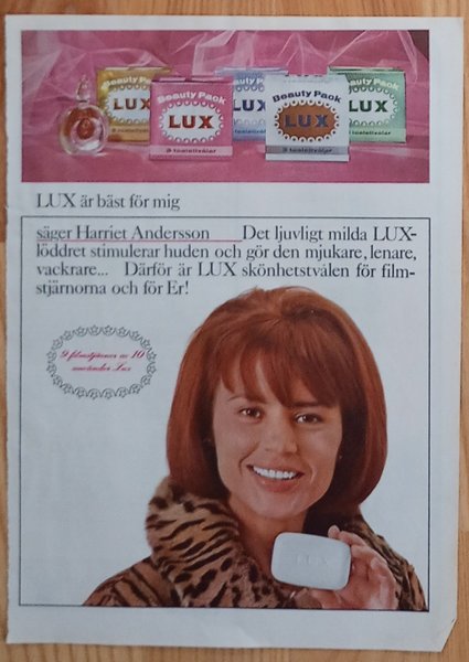 Tidningssida med LUX-reklam. "9 filmstjärnor av 10 använder LUX toalettvål"/Filmstjärnor världen över använder Lux"