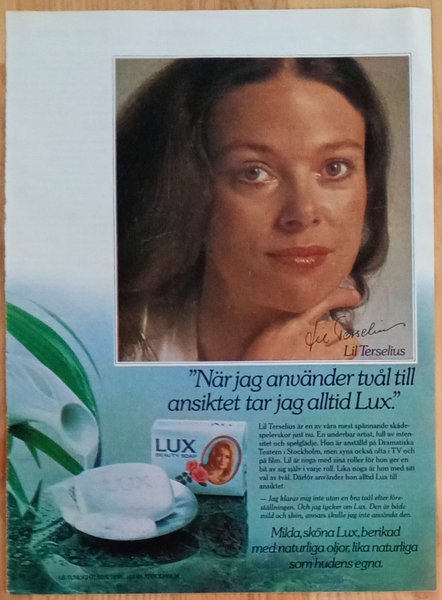 Tidningssida med LUX-reklam. "9 filmstjärnor av 10 använder LUX toalettvål"/Filmstjärnor världen över använder Lux"