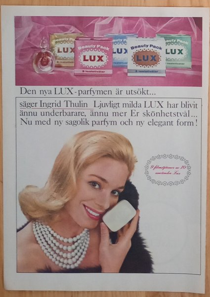 Tidningssida med LUX-reklam. "9 filmstjärnor av 10 använder LUX toalettvål"/Filmstjärnor världen över använder Lux"
