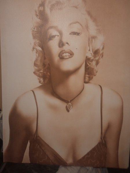 Affisch med Marilyn Monroe i sepia-toner. Hon bär ett halsband med ett hjärtformat hänge och en topp med tunna axelband.