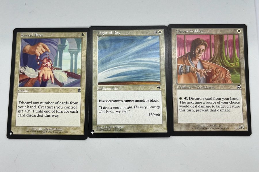 Tre Magic The Gathering-kort: Sacred Rites, Light of Day och Charm Peddler.