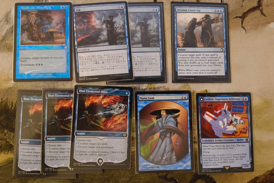 Magic the Gathering kort säljes. Inkluderar Muddle the Mixture, ??, Devious Cover-Up, Blue Elemental Blast, Mana Leak, Jetfire, Ingenious Scientist.