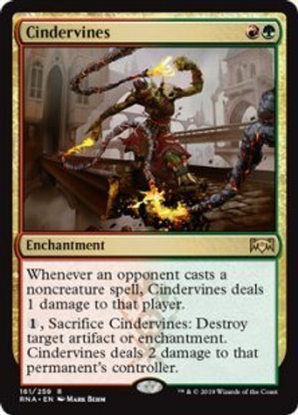 Cindervines är ett röd-grönt enchantment som långsamt straffar motståndare för varje noncreature spell de spelar.