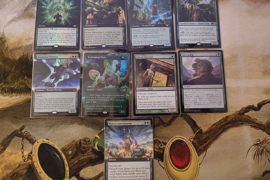 Magic the Gathering kort säljes. Inkluderar: Verdant Mastery, Fight Rigging, Dragonsguard Elite, Jolrael, Mwonvuli Recluse, Doomskar Warrior, Scavenging Ooze, Sylvan Caryatid, Ashaya's Growth (japansk), Nylea's Intervention.