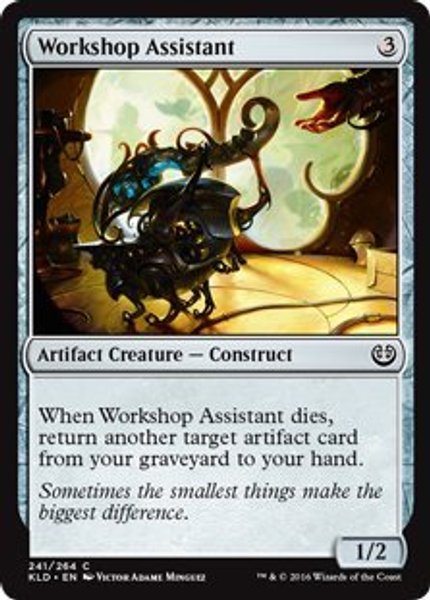 Workshop Assistant är en artefaktvarelse som ger värde när den dör genom att ta tillbaka en annan artefakt från graven till handen. Ett enkelt men användbart kort i artefaktfokuserade Commander- och casuallekar med sacrifice- eller recursion-tema.