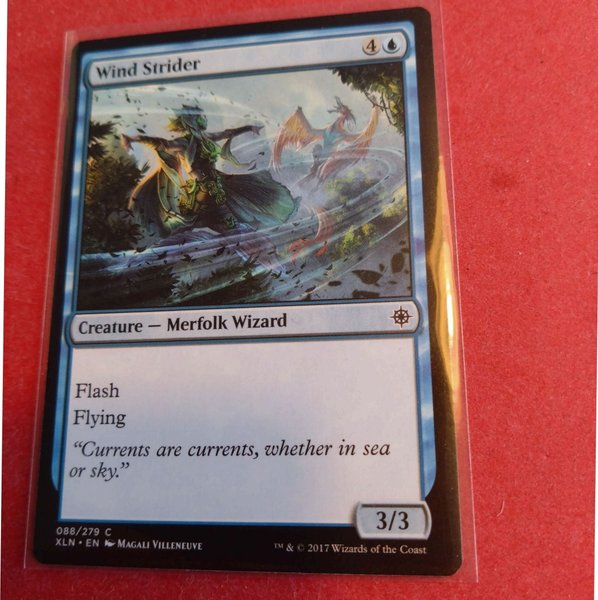 Magic The Gathering kort från serien XLN. Kortnamn: Wind Strider. Creature - Merfolk Wizard. Tryckt 2017 av Wizards of the Coast.