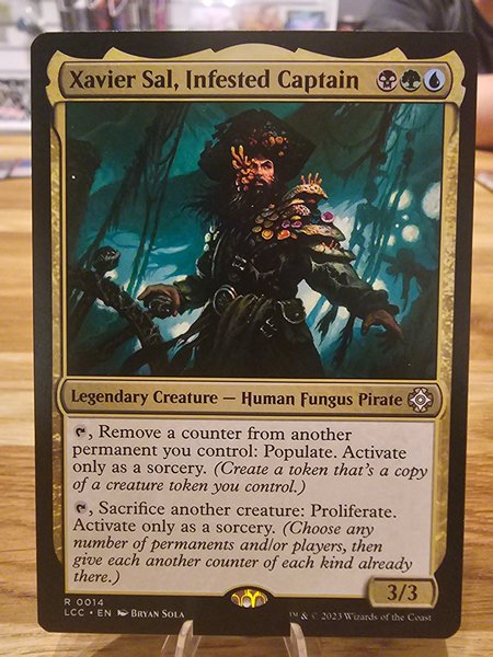 Magic: The Gathering kort - Xavier Sal, Infested Captain. Legendary Creature - Human Fungus Pirate. R 0014 LCC EN BRYAN SOLA. 3/3. TM & © 2023 Wizards of the Coast