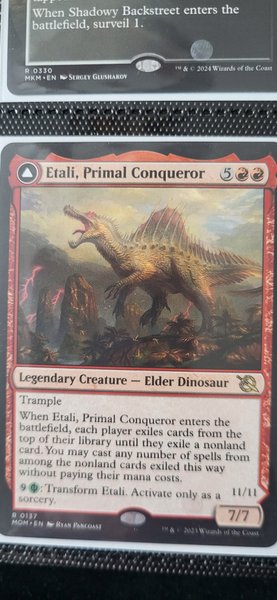 Kortet är Etali, Primal Conqueror, ett legendariskt väsen av typen Elder Dinosaur med Trample. När Etali, Primal Conqueror kommer in på slagfältet, exilerar varje spelare kort från toppen av sitt bibliotek tills de exilerar ett icke-landkort. Du får spela valfritt antal trollformler från de exilerade icke-landkorten utan att betala deras manakostnader. För 9 och grönt mana kan du transformera Etali. Aktivera endast som en sorcery. Kortet har 7/7 i styrka och tålighet.