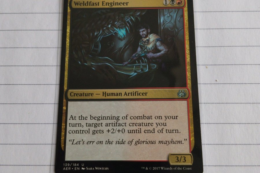 Kortet "Weldfast Engineer" från Magic the Gathering. Mana kostnad är 1 röd och 1 svart. Kortet är en varelse – mänsklig artifice med styrka 3 och tålighet 3. Korttexten lyder: "I början av strid på din tur får en artefaktvarelse du kontrollerar +2/+0 fram till slutet av turen." Kortet är numrerat 139/184 och är av typen Uncommon (U). Setet är Aether Revolt (AER). Illustratör är Sara Winters.