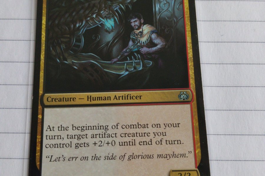 Kortet är av typen varelse – människa, artificer. Vid början av strid på din tur får en artefaktvarelse du kontrollerar +2/+0 fram till slutet av turen. Kortet har texten "Let's err on the side of glorious mayhem." Kortet är numrerat 139/184 U från uppsättningen AER på engelska, illustrerat av Sara Winters. TM & © 2017 Wizards of the Coast.