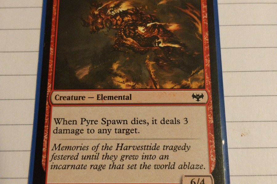 Kortet är av typen "Creature - Elemental" och heter Pyre Spawn. När Pyre Spawn dör, utdelar den 3 skada till valfritt mål. Kortet har 6 i attack och 4 i försvar. Det är nummer 173 av 277 från VOW-utgåvan. Illustratör är Nicholas Gregory.