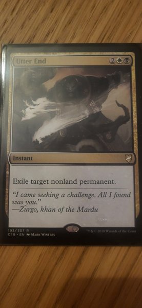 Kortet "Utter End" från Magic the Gathering. Kortet är av typen Instant och har texten "Exile target nonland permanent." Konstnären är Mark Winters och kortet är från 2018.