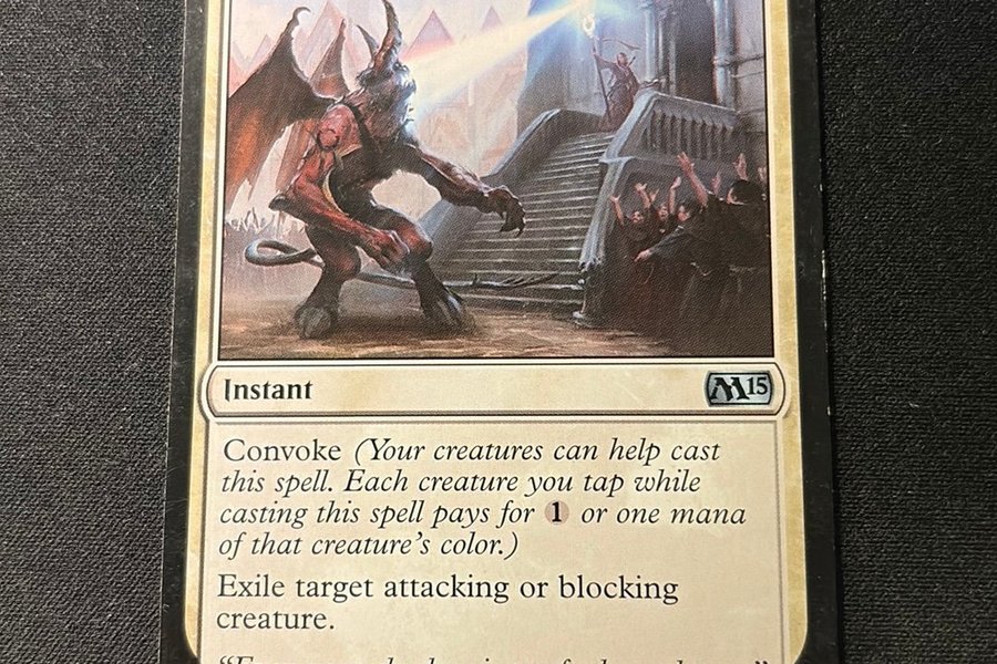Magic: The Gathering kortet Devouring Light från setet M15. Instant kort med Convoke förmåga. Exilar en attackerande eller blockerande varelse.