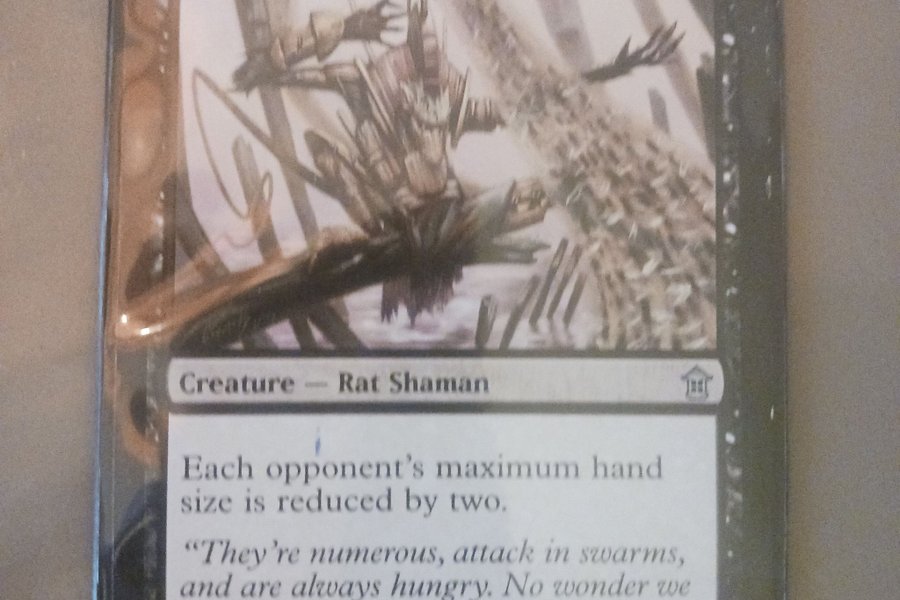 Kortet "Locust Miser" från Magic the Gathering. Typ: Varelse - Råtta Shaman. Varje motståndares maximala handstorlek reduceras med två. Styrka/Tålighet: 2/2.
