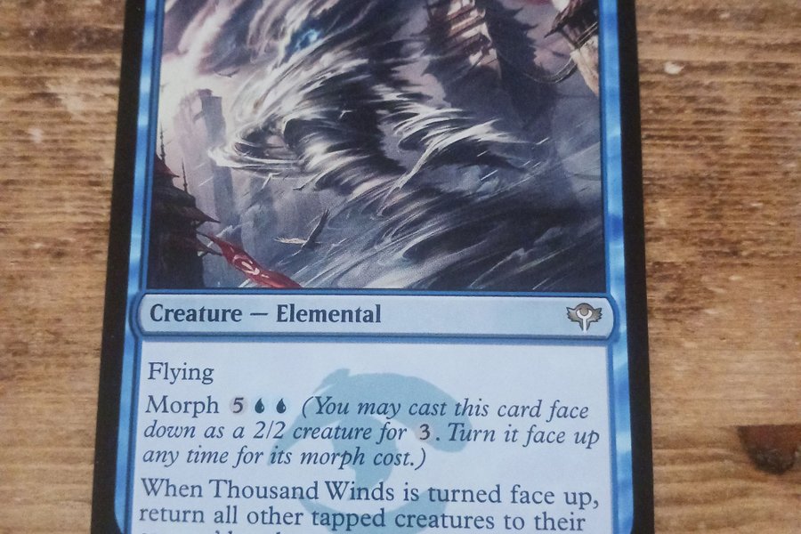 Kortet är av typen "Creature - Elemental" och har förmågorna Flying och Morph 5. När Thousand Winds vänds uppåt, återför alla andra tappade varelser till sina ägares händer. Kortet har styrkan 5/6. Det är nummer 058/082 R från DDN EN-serien och illustrerades av Raymond Swanland. Utgivet 2014 av Wizards of the Coast.