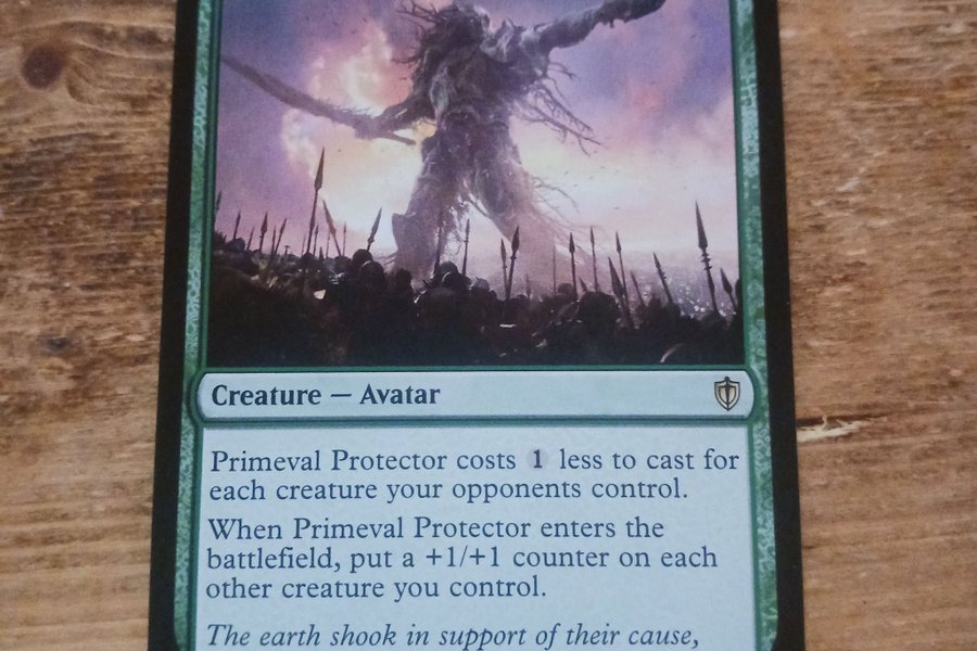 Kortet "Primeval Protector" från Magic the Gathering. Kortet är av typen "Creature - Avatar" och har kostnaden 10. Dess förmåga är att den kostar 1 mindre att spela för varje varelse dina motståndare kontrollerar. När Primeval Protector kommer in på slagfältet, lägg en +1/+1 räknare på varje annan varelse du kontrollerar. Kortet har styrkan 10 och tåligheten 10. Illustratör är Jaime Jones.