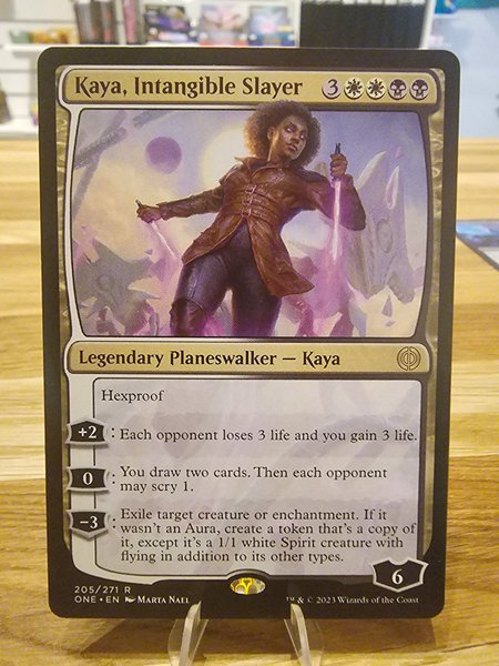 Kaya, Intangible Slayer är en legendarisk planeswalker med hexproof. Dess förmågor inkluderar att få motståndare att förlora liv och dig att få liv, dra kort och låta motståndare scry 1, samt exilera en varelse eller förtrollning och skapa en 1/1 vit Spirit-token med flygande om det inte var en Aura.