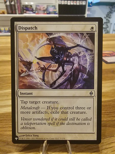 Kortet "Dispatch" är ett Instant-kort. Det har förmågan "Metalcraft", vilket innebär att om du kontrollerar tre eller fler artefakter, exilerar du den valda varelsen. Kortet är illustrerat av Erica Yang och är nummer 7 av 175 från 2011 års upplaga.