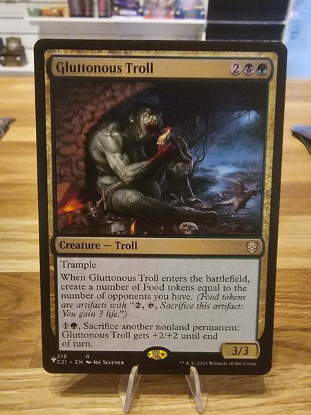 Kortet är av typen "Creature - Troll" med förmågan Trample. När Gluttonous Troll kommer in på slagfältet, skapar du ett antal Food-tokens lika med antalet motståndare du har. (Food-tokens är artefakter med "2, T, offra denna artefakt: Du får 3 liv.") För 1, svart mana och genom att offra en annan icke-land permanent, får Gluttonous Troll +2/+2 fram till slutet av turen. Kortet har styrkan 3 och tåligheten 3.
