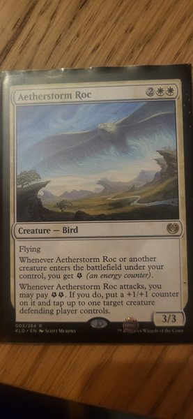 Kortet är av typen varelse — fågel med förmågan flygande. När Aetherstorm Roc eller en annan varelse kommer in på slagfältet under din kontroll, får du en energiräknare. När Aetherstorm Roc attackerar, kan du betala två energiräknare. Om du gör det, lägg en +1/+1 räknare på den och tappa upp till en varelse som den försvarande spelaren kontrollerar. Kortet har styrka 3 och tålighet 3.