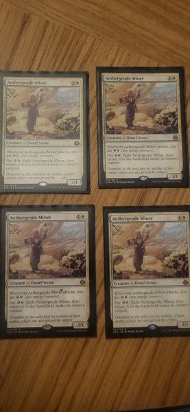 Fyra exemplar av kortet Aethergeode Miner från Magic the Gathering. Kortet är av typen varelse – dvärgscout. När Aethergeode Miner attackerar får du två energiräknare. Du kan betala två energiräknare för att exilera Aethergeode Miner och sedan återföra den till slagfältet under dess ägares kontroll. Kortet har styrkan 3 och tåligheten 1.