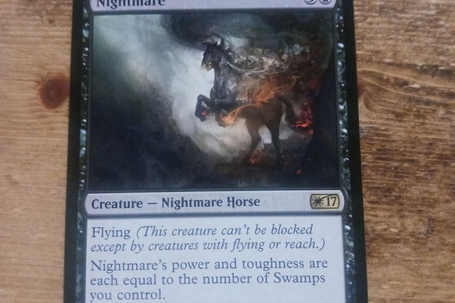 Kortet Nightmare från Magic the Gathering. Mana: 5 svart. Typ: Varelse – Mardrömshäst. Flygande (Denna varelse kan inte blockeras utom av varelser med flygande eller räckvidd.) Nightmares styrka och tålighet är lika med antalet träsk du kontrollerar. Kortnummer: 017/030. Sällsynthet: R (Rare). Set: W17. Språk: Engelska. Konstnär: Vance Kovacs. Utgivningsår: 2017.