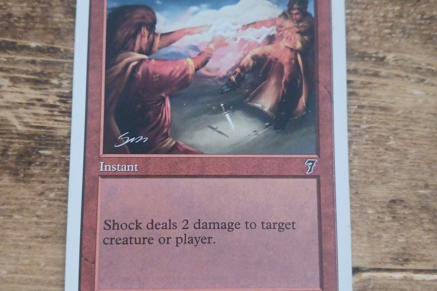 Kortet "Shock" från Magic the Gathering. Kortet är illustrerat av Mike Sass och är från 1993-2001 Wizards of the Coast, Inc. 219/350. Kortet är av typen Instant och texten lyder: "Shock deals 2 damage to target creature or player."