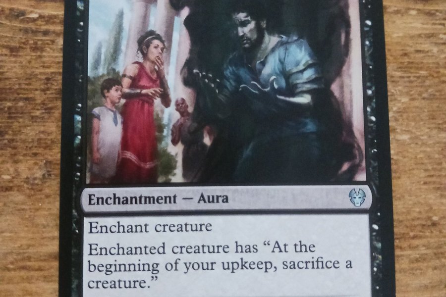Kortet är av typen Enchantment — Aura. Det förtrollar en varelse. Den förtrollade varelsen har förmågan: ”I början av din upkeep, offra en varelse.” Kortet är från 2020 Wizards of the Coast.