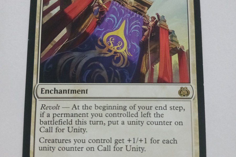 Ett förtrollningskort från Magic the Gathering-universumet. Kortet heter "Call for Unity" och har förmågan Revolt. I slutet av din tur, om en permanent du kontrollerade lämnade slagfältet denna tur, lägger du en enhetsräknare på Call for Unity. Varelser du kontrollerar får +1/+1 för varje enhetsräknare på Call for Unity. Kortet är numrerat 009/184 R och är från uppsättningen AER (Aether Revolt). Illustratören är John Severin Brassell.