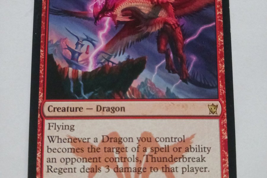 Kortet är av typen "Creature - Dragon" med förmågan "Flying". När en drake du kontrollerar blir måltavla för en trollformel eller förmåga som en motståndare kontrollerar, tillfogar Thunderbreak Regent 3 skada på den spelaren. Kortet har styrka 4 och tålighet 4.