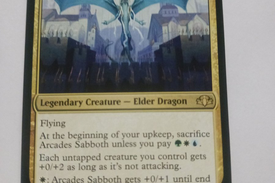 Kortet är Arcades Sabboth, ett legendariskt varelse – äldre drake. Det har flygförmåga. I början av din upkeep, offra Arcades Sabboth om du inte betalar en grön, en vit och en blå mana. Varje otappad varelse du kontrollerar får +0/+2 så länge den inte attackerar. För en vit mana får Arcades Sabboth +0/+1 fram till slutet av turen. Kortet har styrka 7 och tålighet 7. Det är nummer 187 av 261 från uppsättningen DMR på engelska och illustrerat av Steven Belledin.