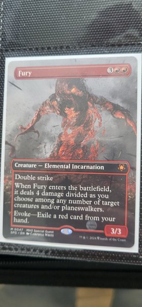 Kortet är av typen "Creature - Elemental Incarnation" med förmågorna "Double strike" och "Evoke". När Fury kommer in på slagfältet, delar den ut 4 skada fördelat som du väljer mellan valfritt antal varelser och/eller planeswalkers. Evoke-kostnaden är att exilera ett rött kort från din hand. Kortet har styrkan 3 och tåligheten 3.