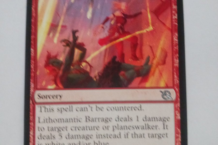 Lithomantic Barrage är en röd sorcery som inte kan kontras. Den tillfogar 1 skada till en varelse eller planeswalker, eller 5 skada om målet är vitt och/eller blått.