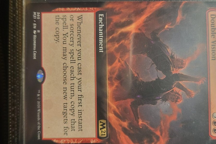 Kortet "Double Vision" från Magic the Gathering. Kortet är av typen Enchantment. När du kastar din första instant- eller sorcery-spell varje tur, kopiera den spellen. Du får välja nya mål för kopian.
