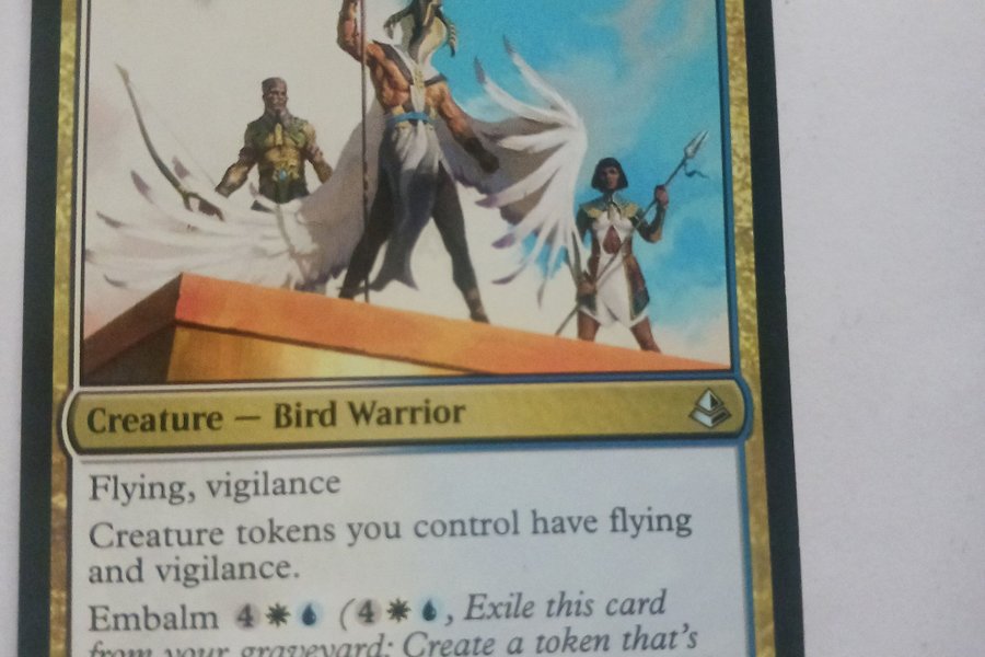 Kortet "Aven Wind Guide" från Magic The Gathering. Det är ett varelsekort av typen Fågelkrigare med flygförmåga och vaksamhet. Kortet har förmågan Embalm.