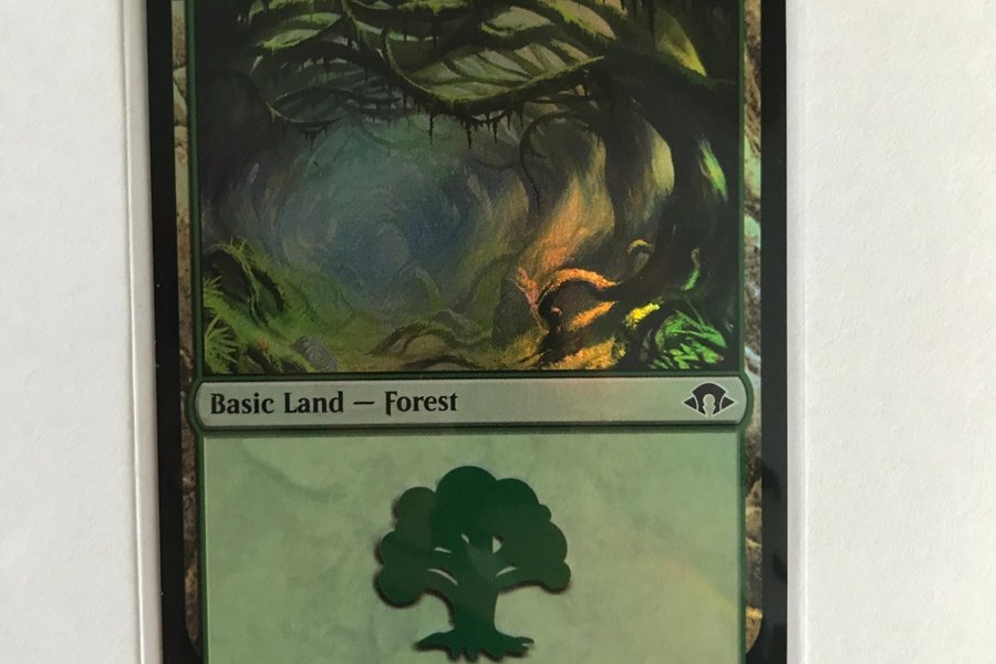 Ett foil Forest-kort från Modern Horizons 3-setet. Perfekt för Magic: The Gathering-samlare och spelare.