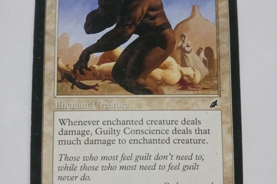Kortet "Guilty Conscience" är ett förtrollningskort som förtrollar en varelse. När den förtrollade varelsen tillfogar skada, tillfogar Guilty Conscience lika mycket skada på den förtrollade varelsen. Kortet är illustrerat av Christopher Moeller och är från 2003.