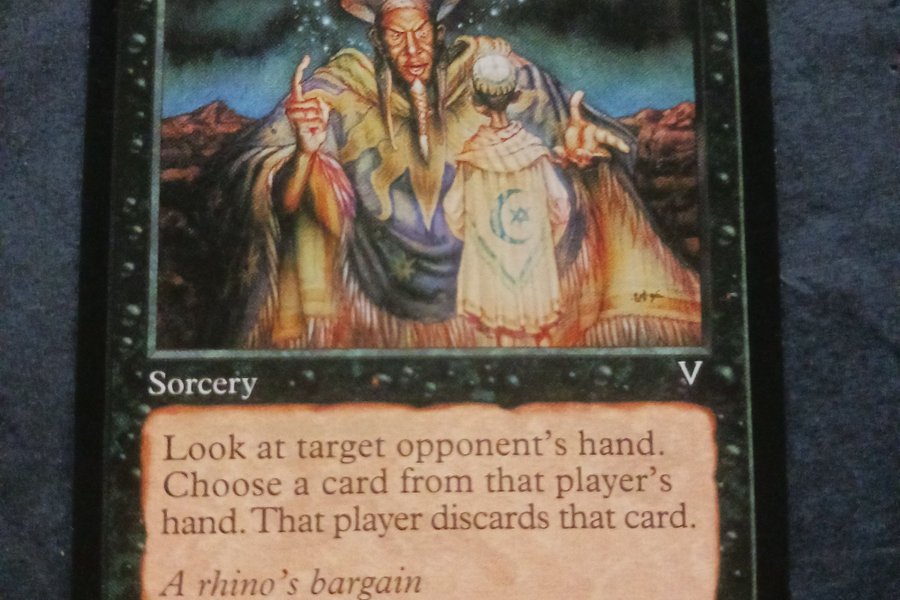 Coercion är ett sorcery-kort. Titta på en motståndares hand, välj ett kort från den handen, och den spelaren kastar det kortet. Illustration av DiTerlizzi.