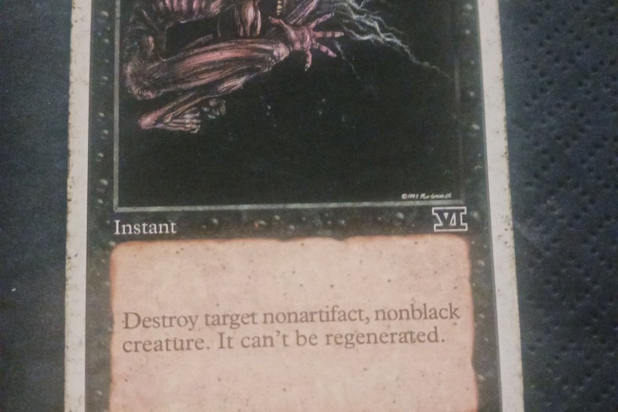 Magic the Gathering-kortet "Terror" från 1993-1999 Wizards of the Coast, Inc. Kortet är illustrerat av Ron Spencer och har texten "Destroy target nonartifact, nonblack creature. It can't be regenerated."