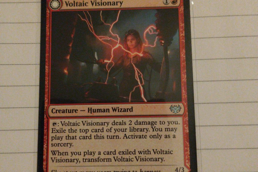Kortet är av typen "Creature - Human Wizard" och har förmågan att ge 2 skada till dig, exilera det översta kortet från ditt bibliotek och låta dig spela det kortet denna tur, men endast som en sorcery. När du spelar ett kort som exilerats med Voltaic Visionary, transformeras Voltaic Visionary. Kortet har styrkan 3/1.