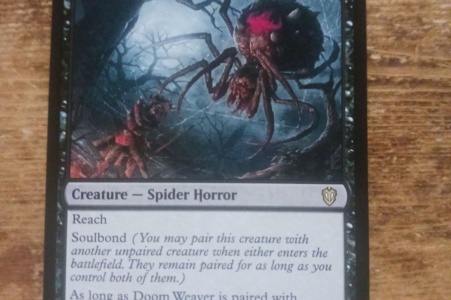 Kortet är av typen "Creature - Spider Horror" med förmågorna Reach och Soulbond. Soulbond låter dig para ihop denna varelse med en annan oparad varelse när någon av dem kommer in på slagfältet. De förblir parade så länge du kontrollerar båda. Så länge Doom Weaver är parad med en annan varelse, har var och en av dessa varelser förmågan "När denna varelse dör, dra kort lika med dess styrka." Kortet har nummer 034/038 och är illustrerat av Helge C. Balzer.