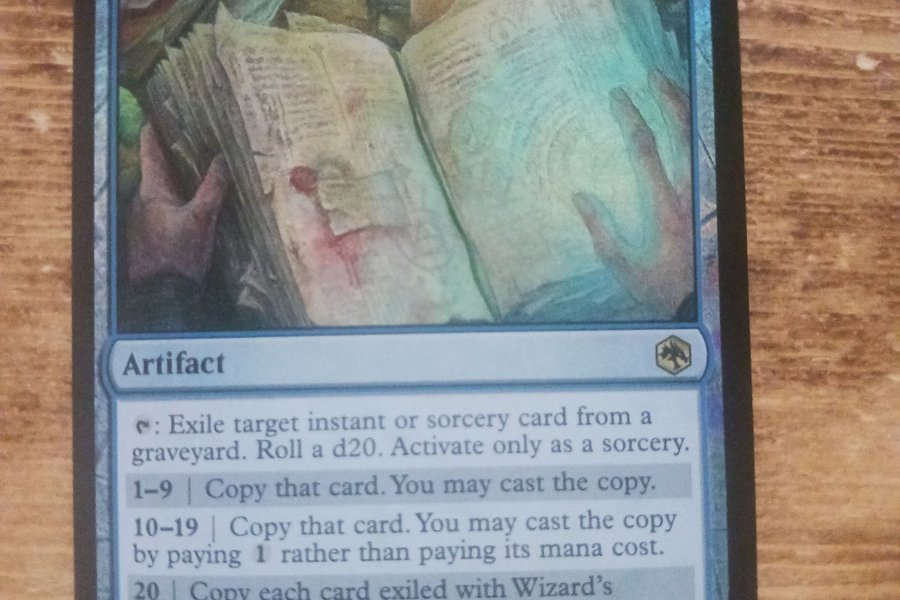 Kortet "Wizard's Spellbook" från Magic the Gathering. Mana kostnad: 5 blå blå. Typ: Artefakt. Text: "Tappa: Exilera ett valfritt instant- eller sorcery-kort från en kyrkogård. Slå en tjugosidig tärning. Aktivera endast som en sorcery. 1-9: Kopiera det kortet. Du får spela kopian. 10-19: Kopiera det kortet. Du får spela kopian genom att betala 1 istället för dess manakostnad. 20: Kopiera varje kort som exilerats med Wizard's Spellbook. Du får spela valfritt antal av kopiorna utan att betala deras manakostnader." Kortnummer: 082/281. Sällsynthet: R (Rare). Set: AFR (Adventures in the Forgotten Realms).