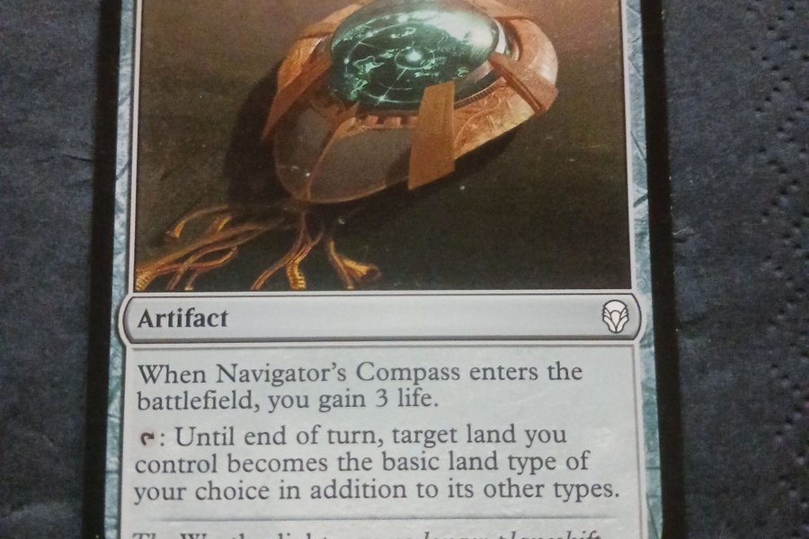Kortet "Navigator's Compass" från Magic the Gathering. När Navigator's Compass kommer in på slagfältet får du 3 liv. Tryck: Fram till slutet av turen blir en landtyp du kontrollerar den grundläggande landtypen du väljer utöver dess andra typer.