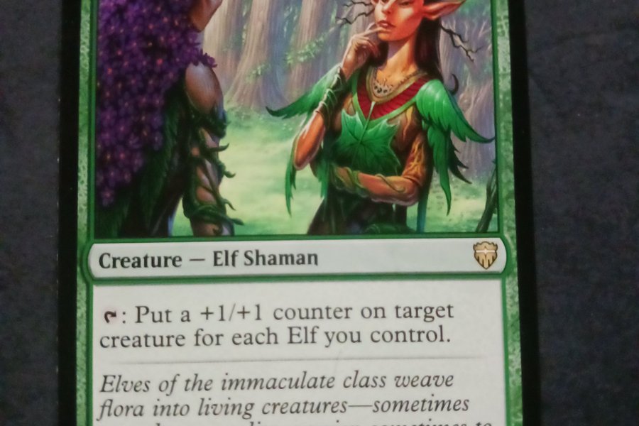 Kortet är av typen "Creature - Elf Shaman" och har texten "Put a +1/+1 counter on target creature for each Elf you control." Kortet har även texten "Elves of the immaculate class weave flora into living creatures—sometimes to endorse an elite warrior, sometimes to create a breathing work of art." Kortet är från upplagan CMR och har kortnummer 234/361.
