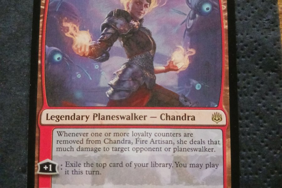 Chandra, Fire Artisan är ett legendariskt planeswalker-kort. När en eller flera lojalitetsräknare tas bort från Chandra, Fire Artisan, delar hon ut lika mycket skada till en målmotståndare eller planeswalker. Dess förmågor inkluderar att exilera det översta kortet från ditt bibliotek och spela det under samma tur (+1), samt att exilera de sju översta korten från ditt bibliotek och spela dem under samma tur (-7). Kortet har en lojalitet på 4.